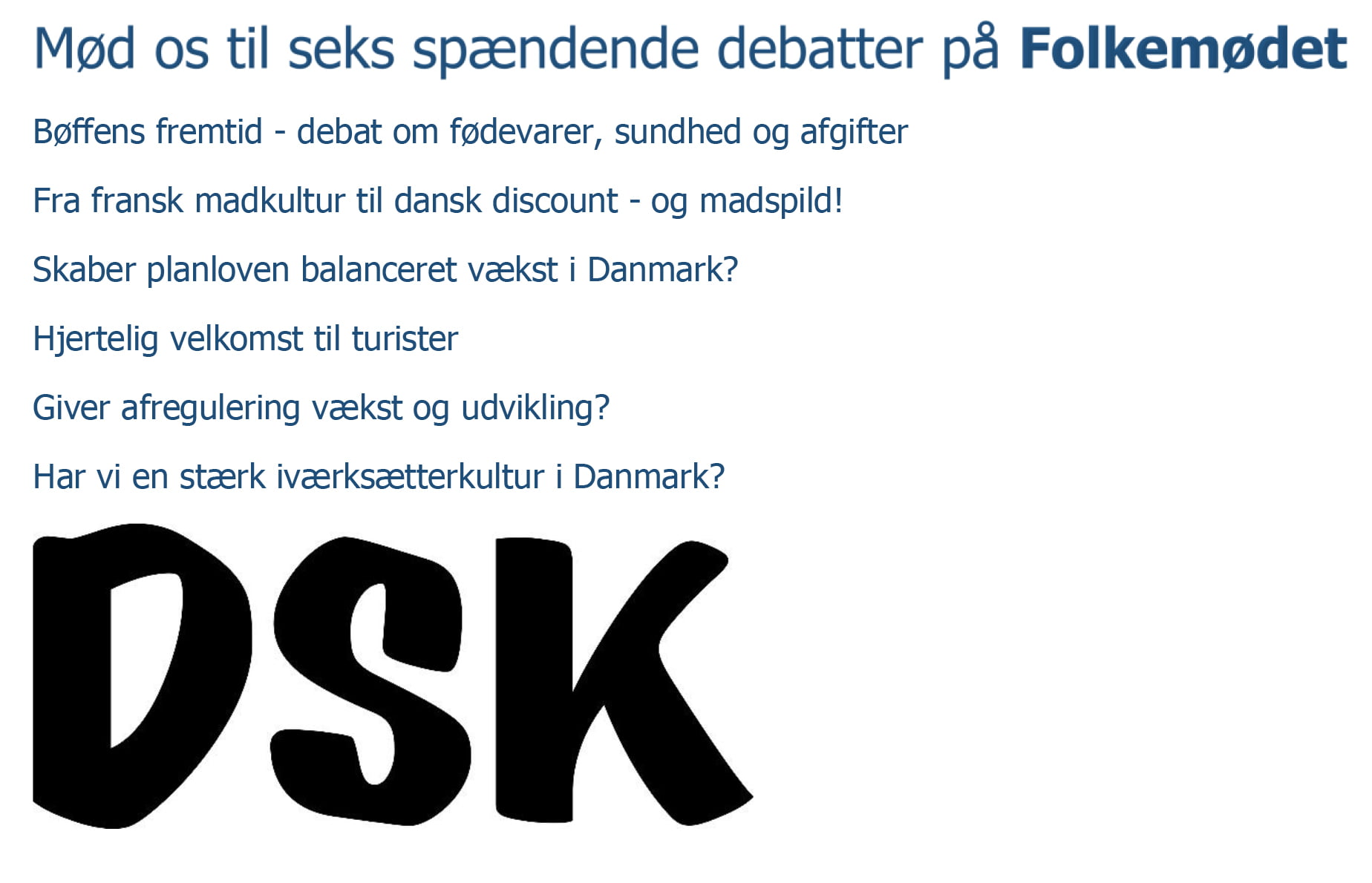 Vi vil i år være aktive deltagere i debatpanelet i seks forskellige debatter. Lørdag formiddag er DSK fx vært for en debat om fødevarer, hvor deltagerne er Frankrigs ambassadør François Zimeray, stifter af Stop Spild af Mad Selina Juul, trendforsker Kirsten Poulsen samt DSKs formand, købmand Lisbeth Dalgaard.
