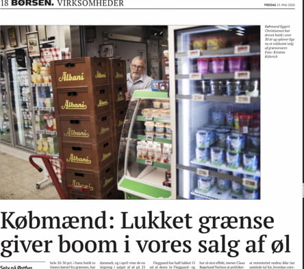 ”Men at grænselukningen til Tyskland ligefrem skulle få den effekt, at salget af øl, slik og sodavand i april steg med hele 20-30 pct. i hans butik to timers kørsel fra grænsen, har overrasket den garvede købmand”. Det skriver dagbladet Børsen i dag.